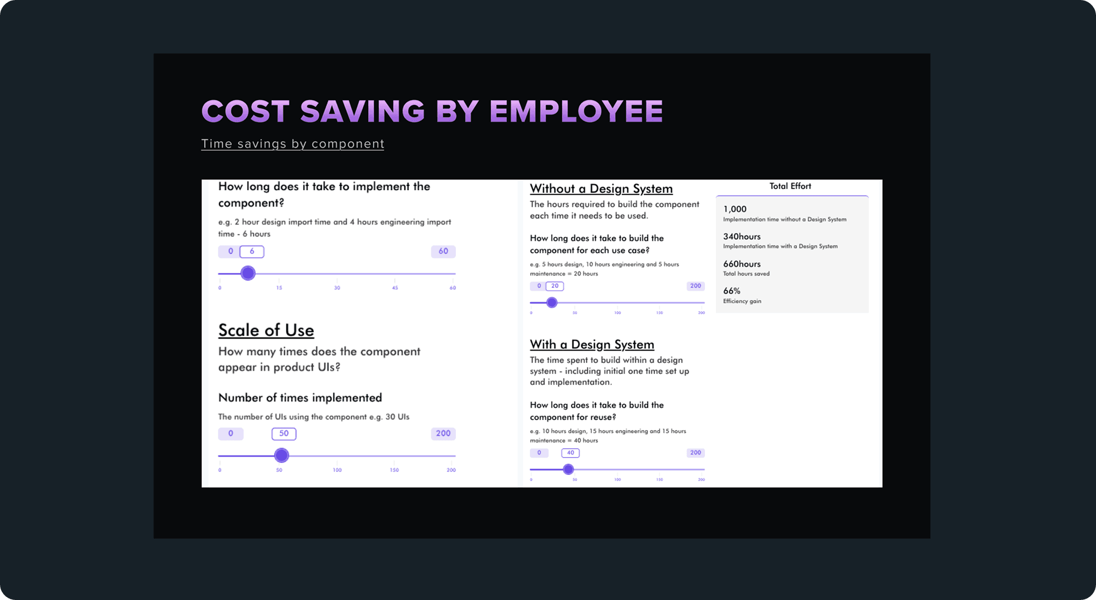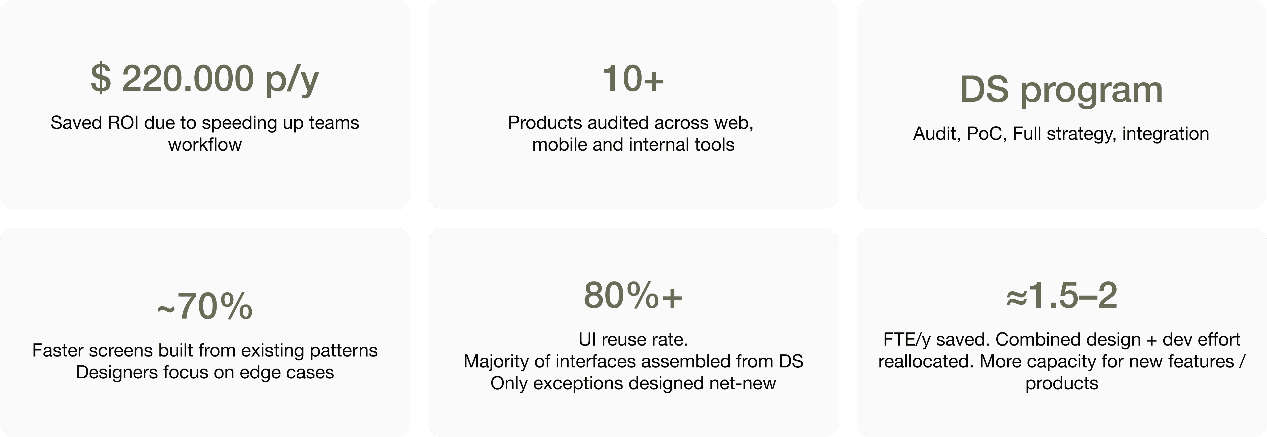 Combined design + front-end efficiency, ≈1.5–2 FTE freed for new work.