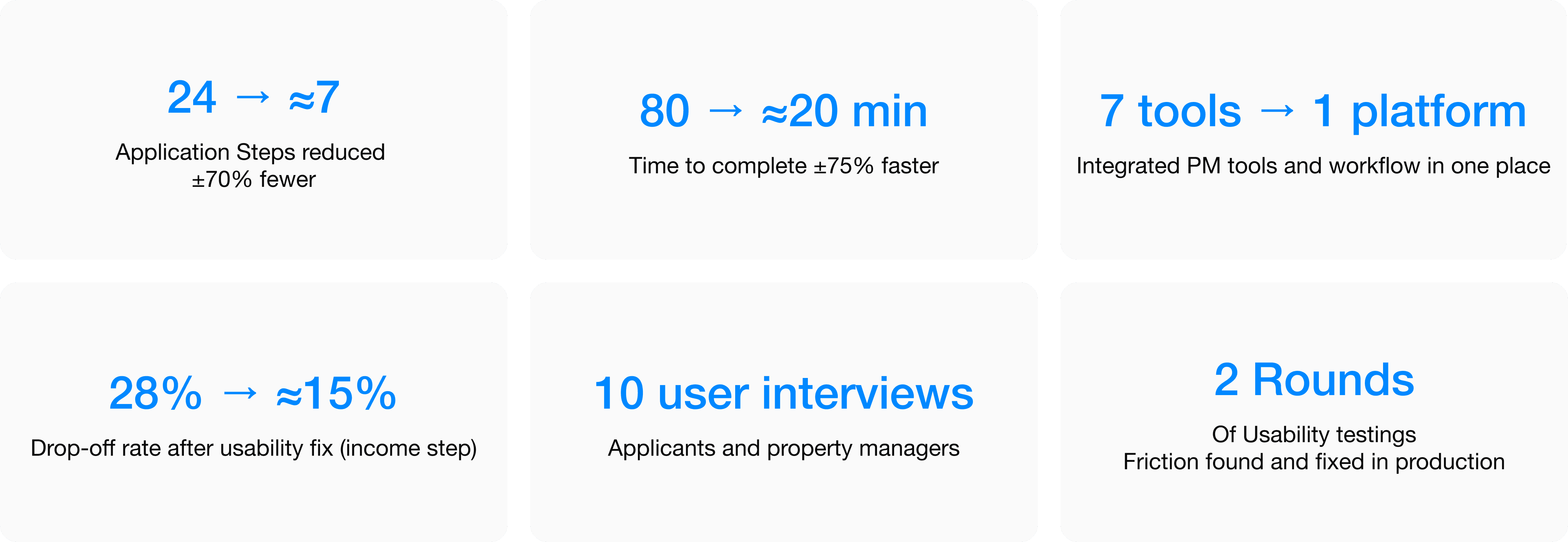 Application steps reduced from 24 to 7 — a 70% reduction. Completion time dropped from 80 minutes to 20–30 minutes — a ~75% improvement. Property managers who saw the product in demo responded immediately: "This is exactly what we've been missing." The product was presented at industry exhibitions in Texas, resulting in new partnerships and additional investment for the client. The company shut down before full-scale launch. But the product worked, users validated it, and the numbers were real.